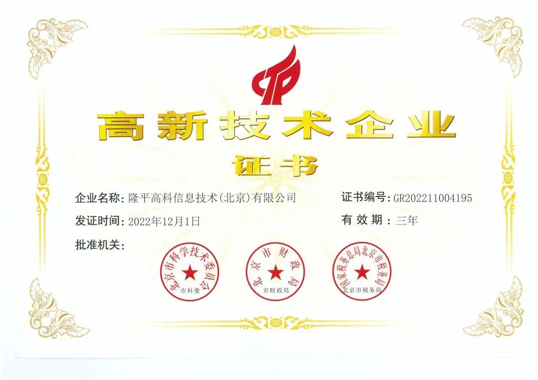 2022年12月1日,隆平信息通过了由国家科技部、财政部和税务总局委托北京市科学技术委员会、财政局、税务局组织的国家“高新技术企业”认定,并荣获国家“高新技术企业”称号。本次成功入选国家高新技术企业,是隆平信息科技成果水平和产品技术含量取得进步的一个里程碑,体现了国家相关部门对隆平信息近年来工作的肯定。
