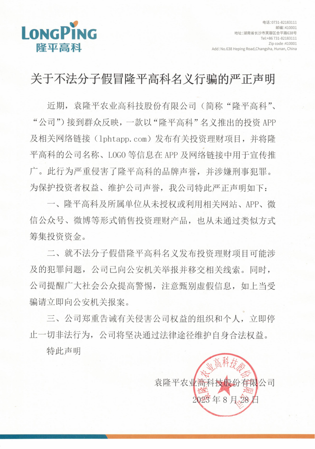 关于不法分子假冒隆平高科名义行骗的严正声明
