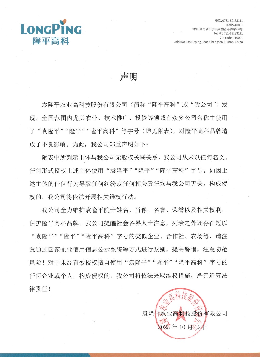 关于不法分子假冒隆平高科名义行骗的严正声明