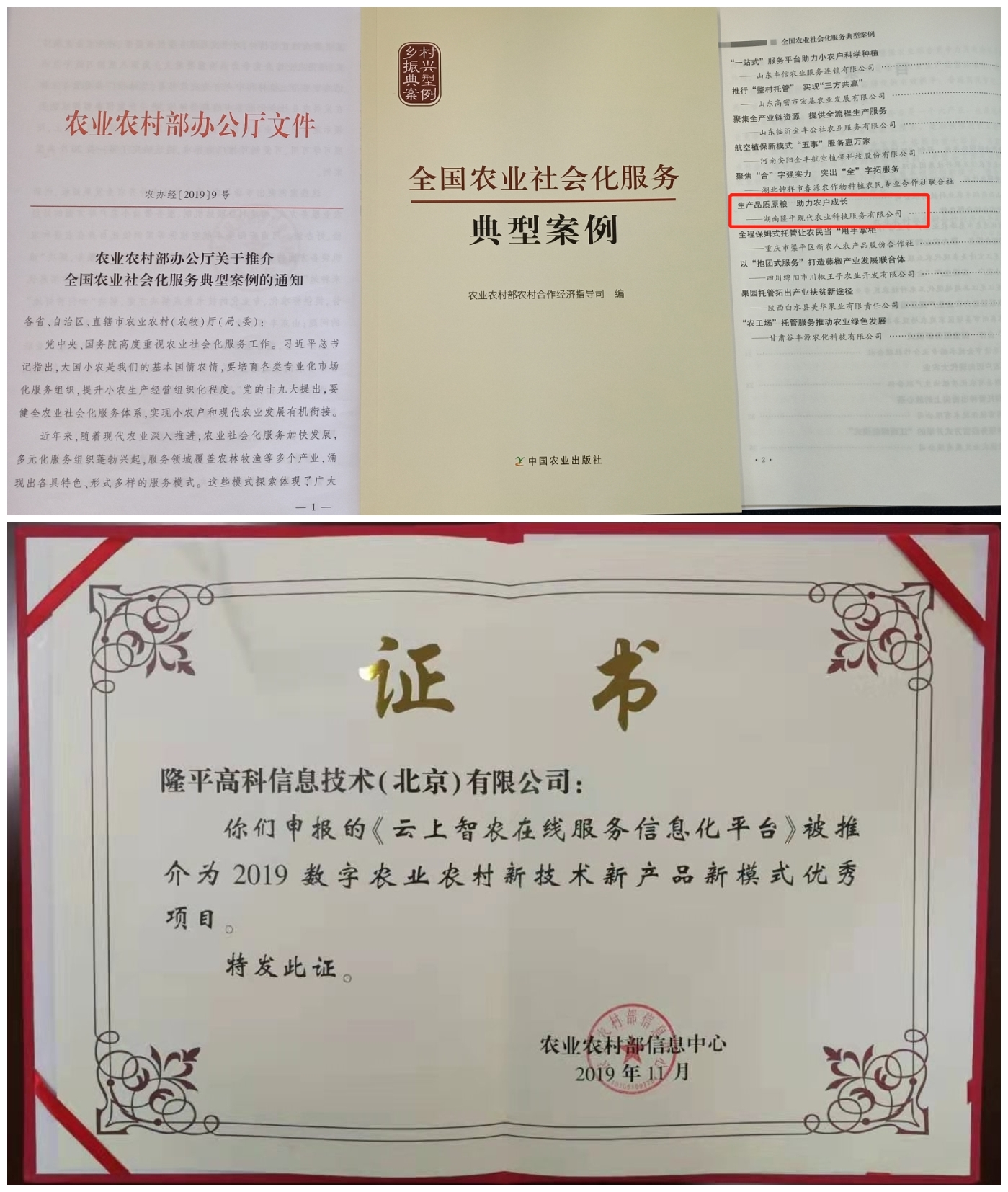 隆平农服品质原粮生产社会化服务模式,入选农业农村部全国首批二十个农业社会化服务典型案例;用户超过200万的云上智农培训平台,被评为2019数字农业农村新技术新产品新模式优秀项目