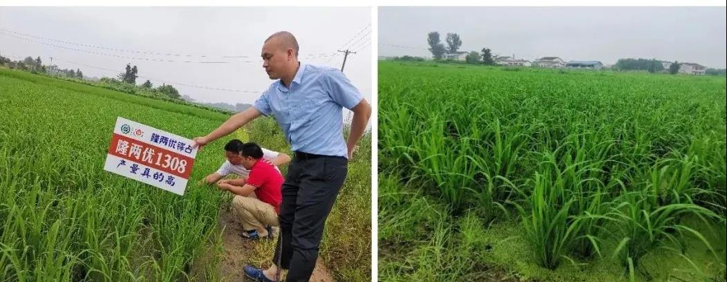 △ 重庆市梁平县,隆8优华占示范田在暴雨后近期遭受水淹,隆平种业农技专家指导其采取补救措施,施叶面肥,弥补根系吸收养分的不足。