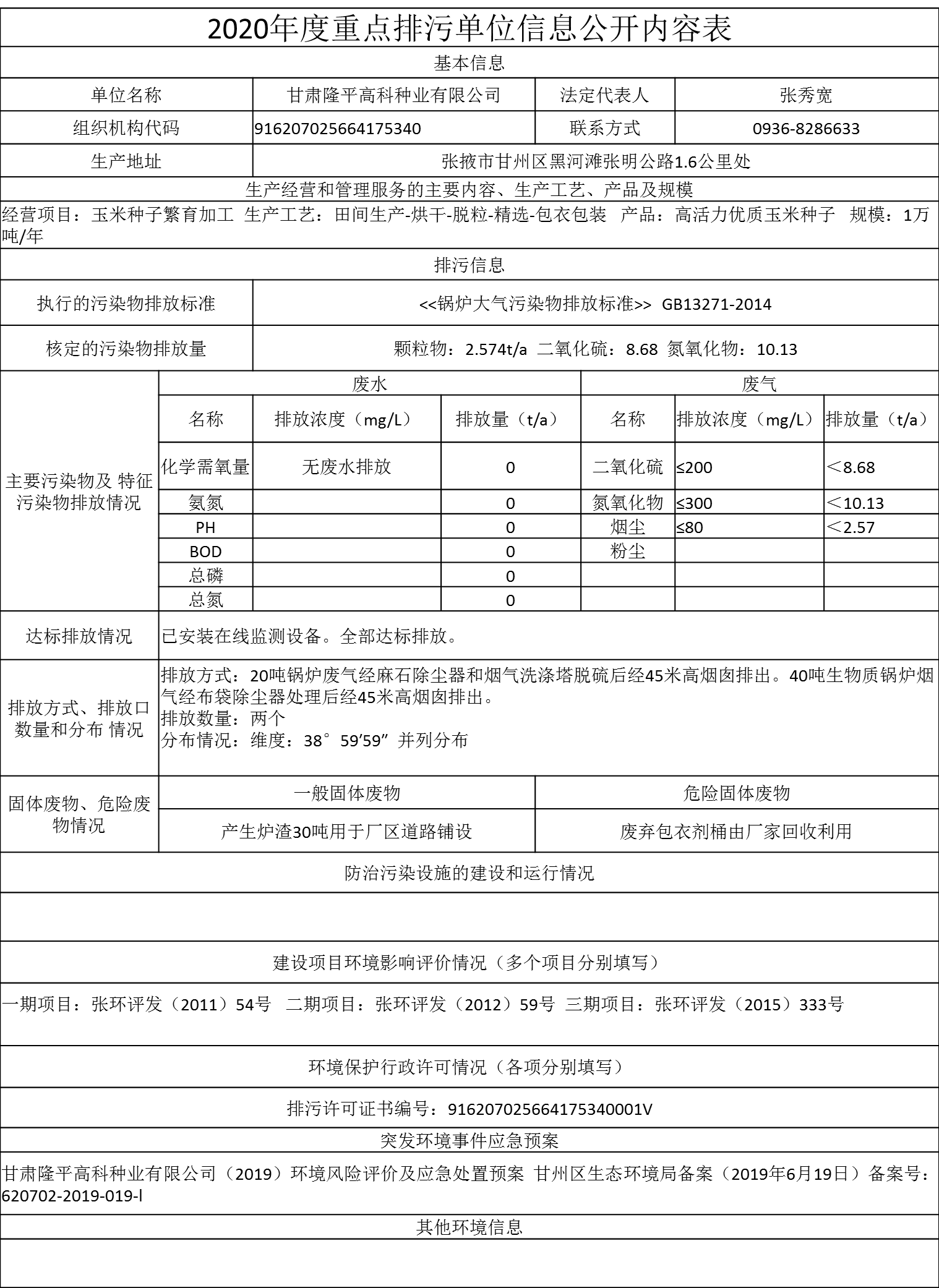 甘肃张掖2020年度重点排污单位信息公开内容表之甘肃隆平